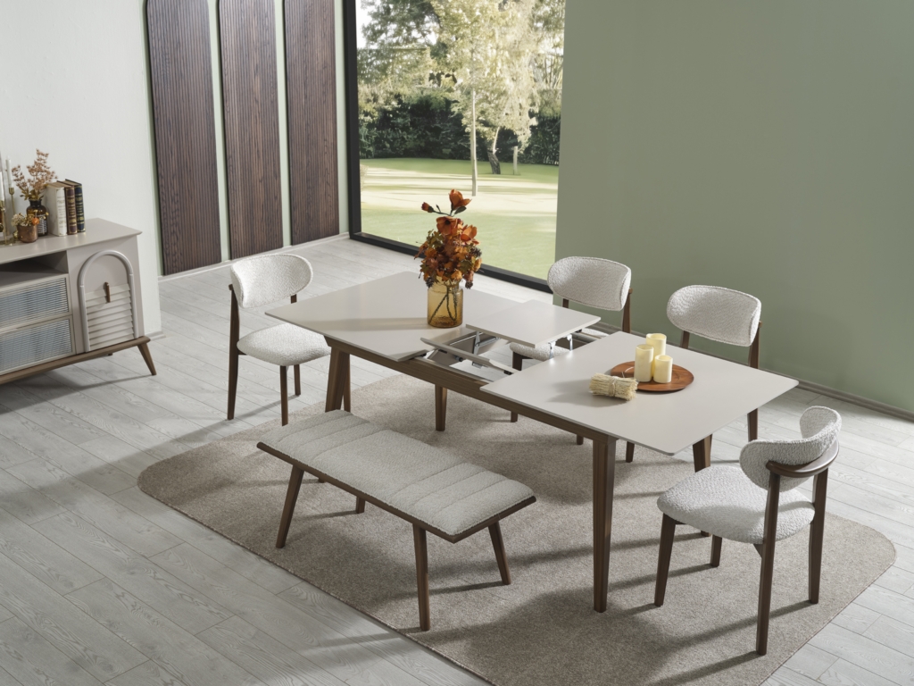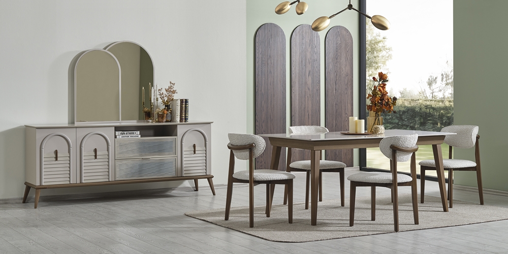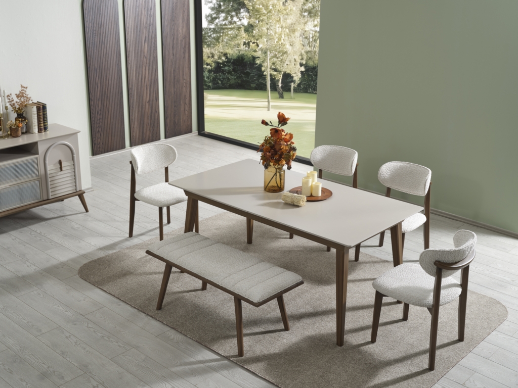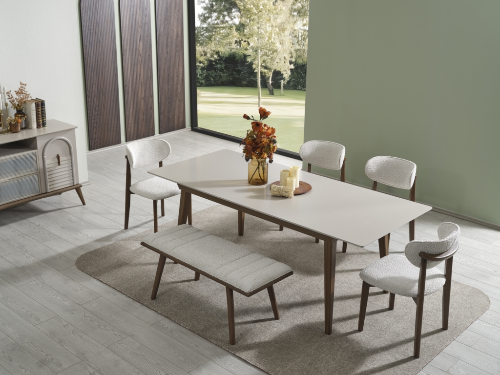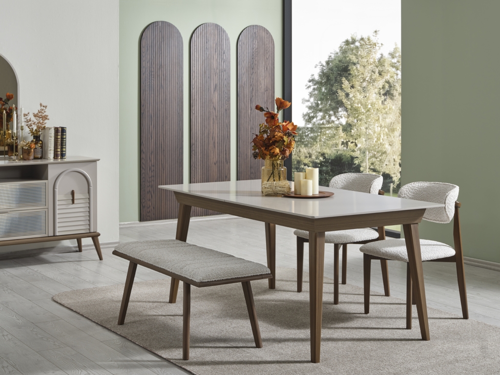 • Takım içeriği; Yemek masası, Konsol, 1 adet konsol aynası, 4 adet sandalye , 1 adet bench den oluşmaktadır.