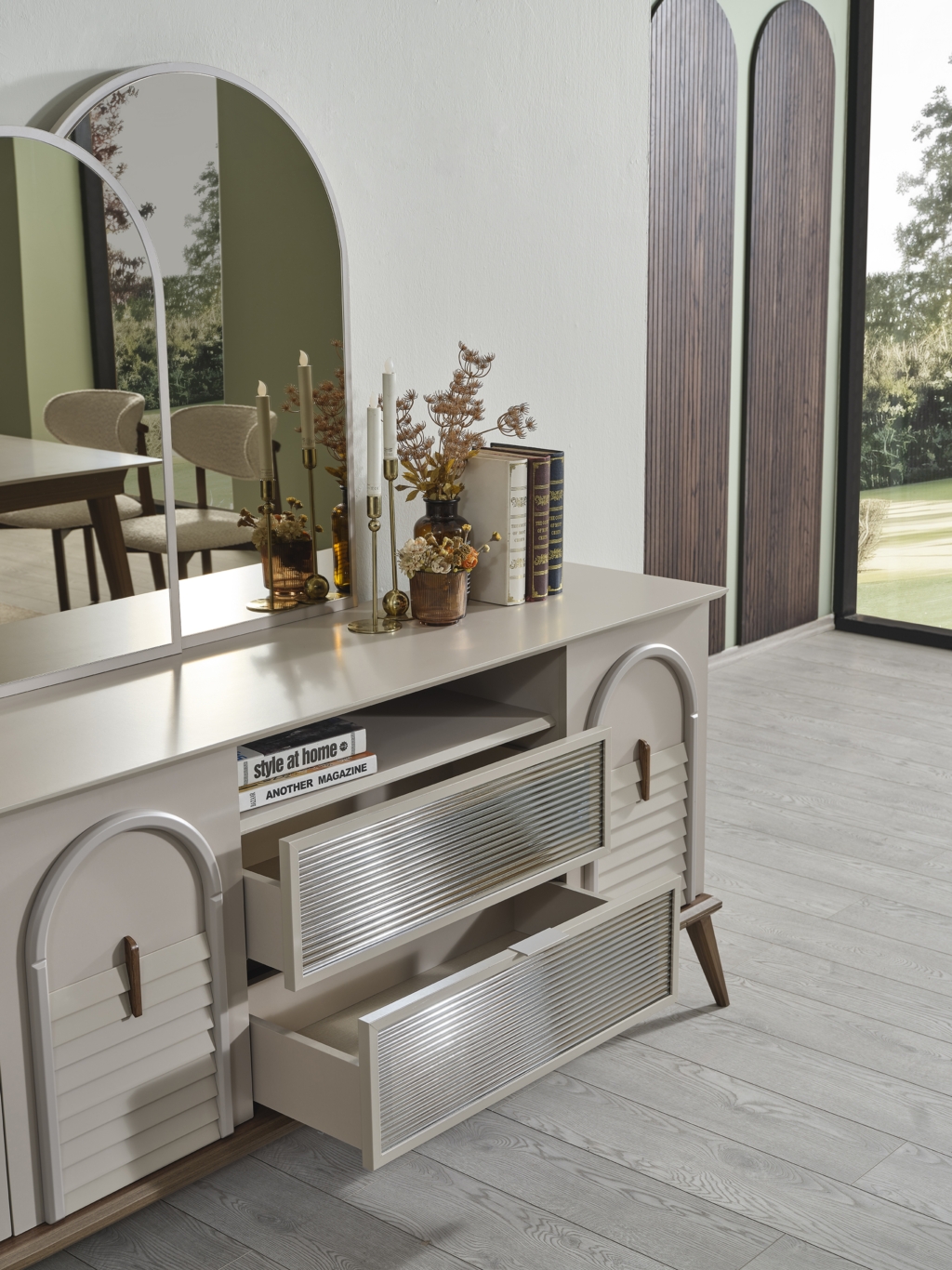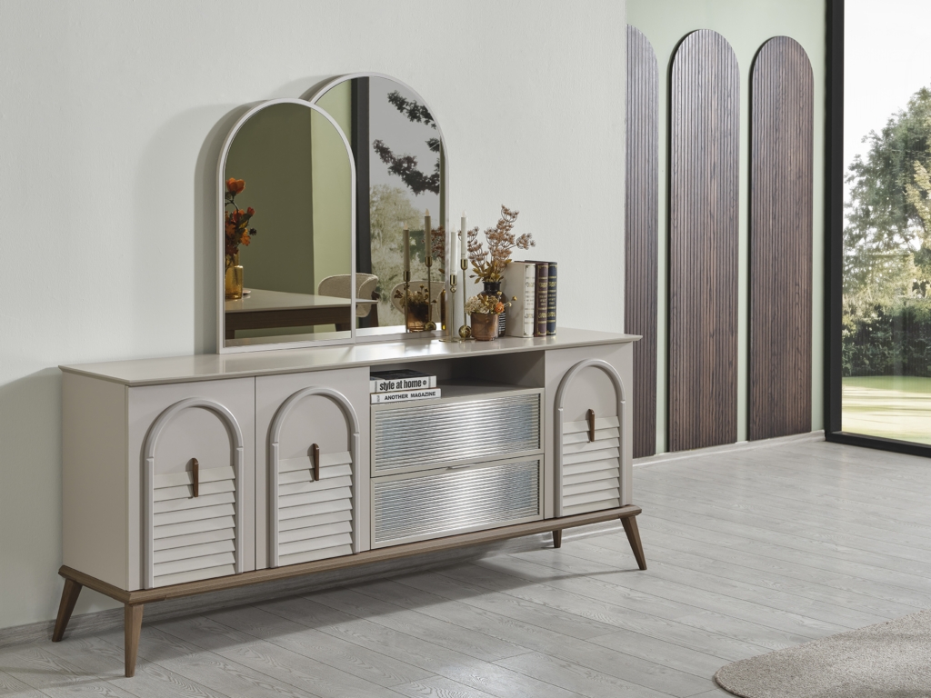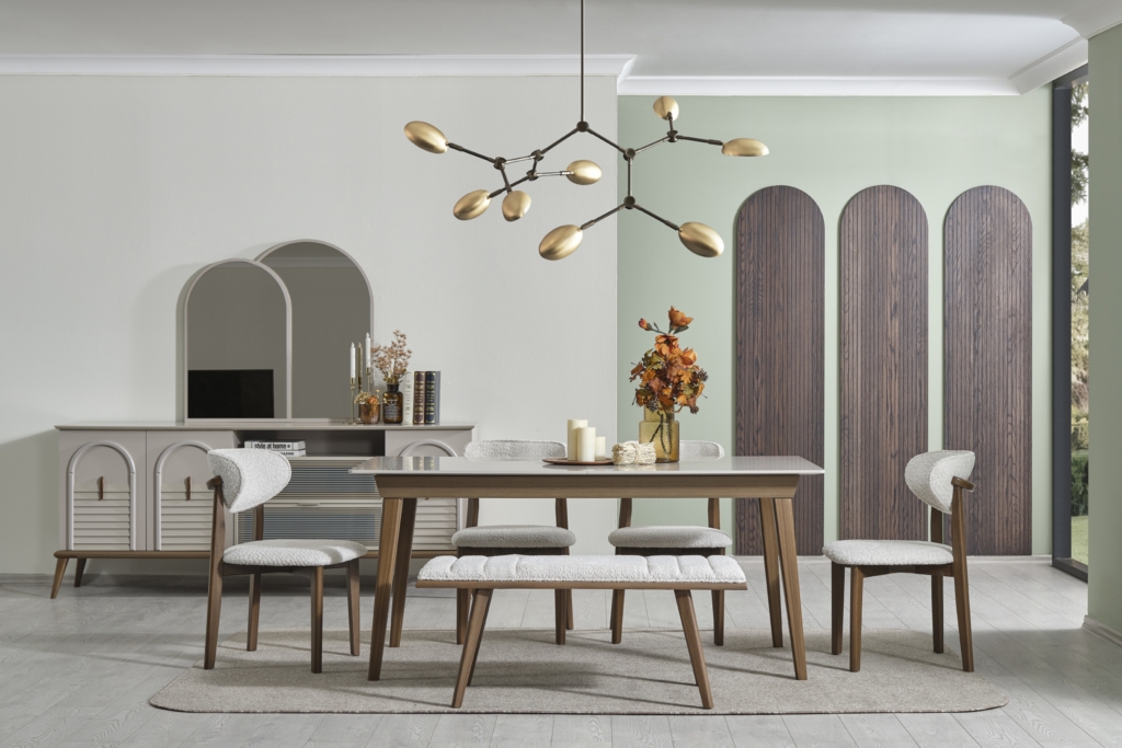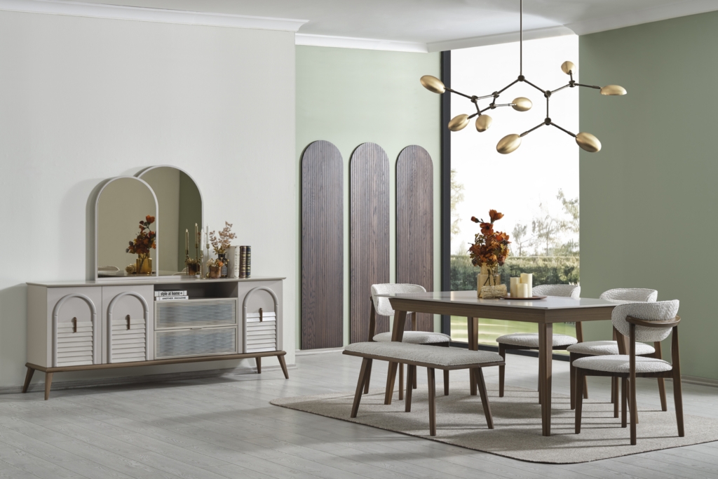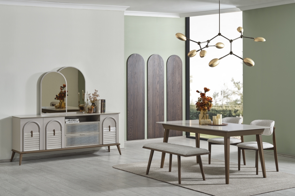 • Takım içeriği; Yemek masası, Konsol, 1 adet konsol aynası, 4 adet sandalye , 1 adet bench den oluşmaktadır.